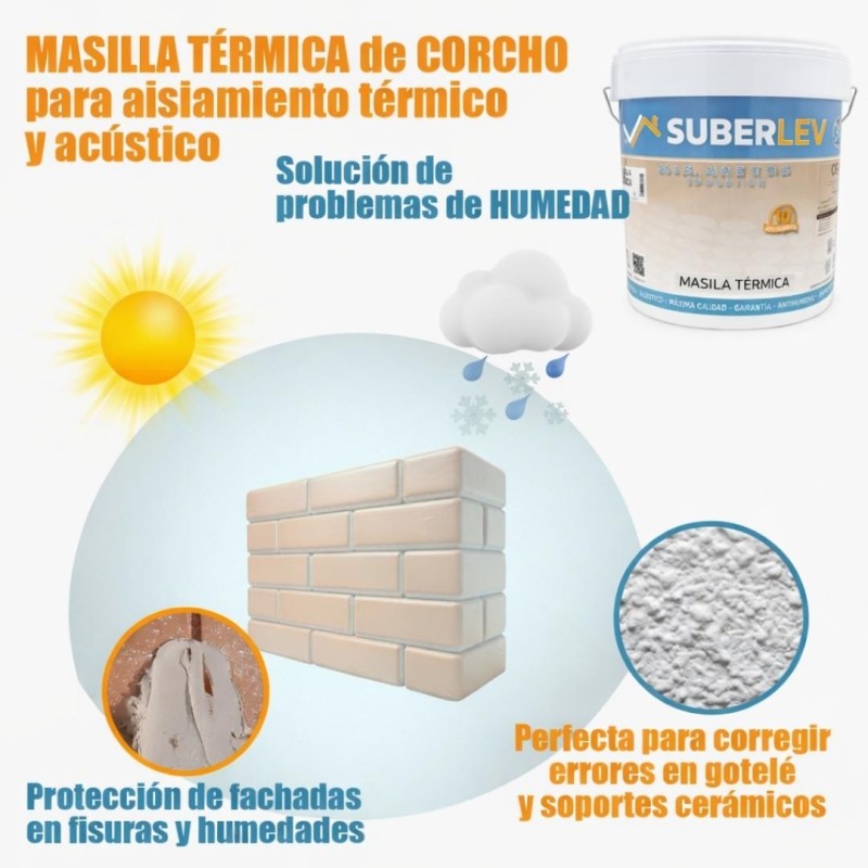 Masilla al uso, formulada a base de copolímeros acrílicos, gránulos de corcho natural y fibras de vidrio, que dota a las superficies de corrección térmica y acústica.